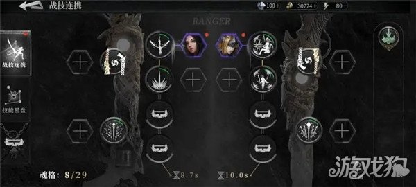 接下来根据指引将破盾者魂核与技能关联,提供属性加成和特色魂技。其中魂技分为主动和被动两种,主动魂技只有紫色及以上非素材魂核拥有,角色施放与该魂核关联的技能时会同时释放主动魂技。要注意每个主动魂技都有单独的冷却,在实际战斗中,非冷却中的技能如果与有主动魂技的魂核关联,其图标下方会有小点提示,其中绿点表示魂技已就绪,而橙色小点表示魂技还在冷却,使用关联技能不会触发相应魂技。