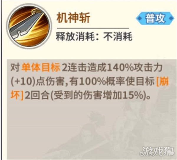 集合爆发与减益效果于一体的绝技是G4机神的亮点,机神连斩除了拥有高额的伤害之外,还能对敌方造成【崩坏】效果,不仅如此,暴击之后还能对敌方造成【虚弱】效果,绝技为三连击,能够提高暴击的概率。