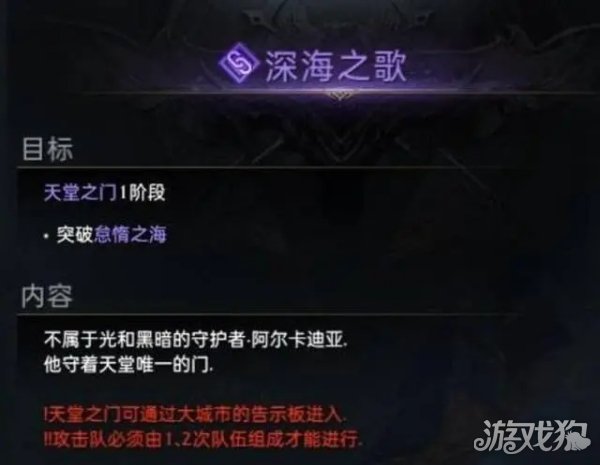 1、天堂之门是深渊地牢中的区域,玩家可以通过大城市的告示板前往天堂之门,需要注意攻击队须由1、2次队伍组成。
