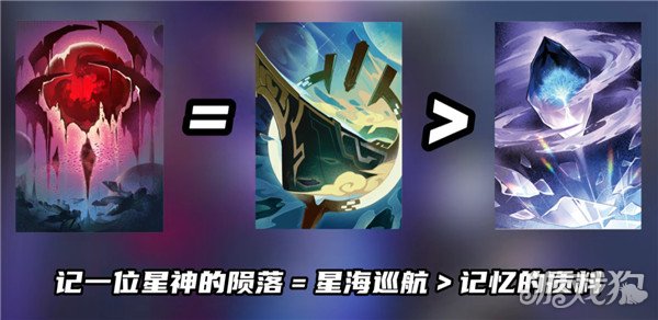 我这边给到的优先级是记一位星神的陨落,等于星海巡航大于记忆的质料,这些光锥后续都是可以白嫖满精的,叠影器就是精炼材料,一共能换12个,正好对应三个光锥。