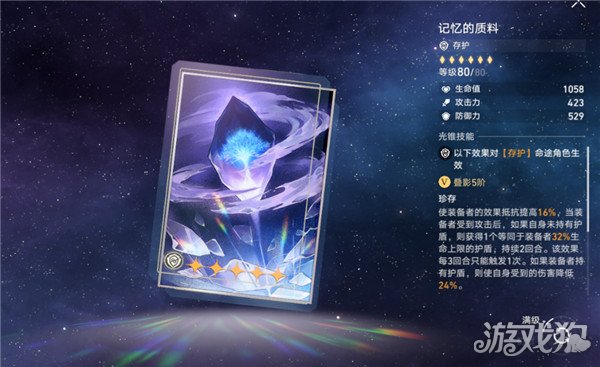 记忆的质料是给存护命途角色使用的,是一个无盾加盾,有盾减伤的光锥。能用的角色有杰帕德、火主、三月七。这个光锥给火主用就非常合适了,因为火主有百分百嘲讽敌人,基本就是打火主,这样就能发挥出这个光锥的全部实力。而杰帕德和三月七都是概率嘲讽,所以就不太适用。