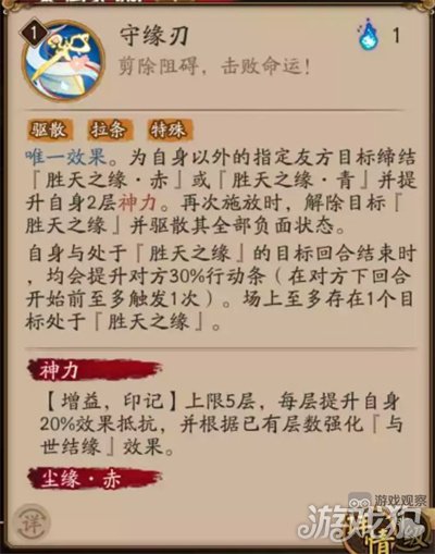 2、SP缘结神有回复、有驱散、有增伤、有护盾,并且继承了SSR阶缘结神给一个式神获得庇护和获得新回合并且妖术减免2点鬼火的特性。