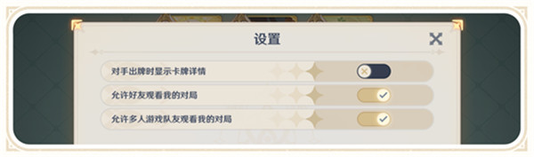 原神4.0七圣召唤新增功能介绍 可以观看对局哦,4.0版本上线了不少七圣召唤相关的功能,那就是观看对局,下面就来看看详细的介绍吧。 1、4.0七圣召唤新增“观看对局”功能。 2、玩家可在好友或者联机界面中观看朋友的七圣召唤对局。 3、还能在牌局内点击设置,自行勾选观看设定即可。 4、默认是允许好友和多人观看对局的,如若不需要可点击关闭。