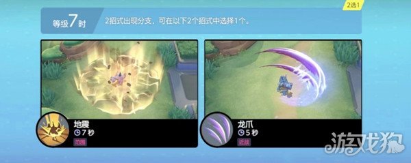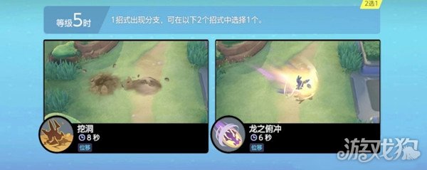 五级时则可以在“挖洞”和“龙之俯冲”这两个技能中进行二选一,两者都算是一种位移手段,不过CD和具体效果略有差异,挖洞的CD虽然更长,但它却可以在位移后对目标区域的宝可梦造成伤害和击飞效果,而且破土而成的地龙还能因此获取额外的双抗加成,所以非常适合先手开人。