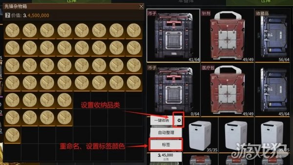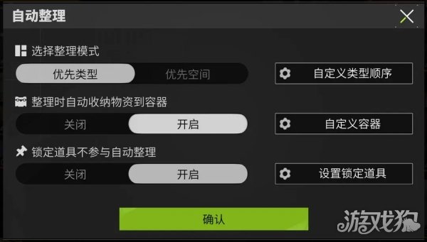 自动整理中有一个好用的设置,是自动收纳物资到容器,相当于帮你点了一遍一键收纳,在我们设置好了收纳箱的收纳种类后,自动整理将直接收纳好你设置的一切物资,另外,整理模式建议选择优先类型,开启锁定道具不参与自动整理。