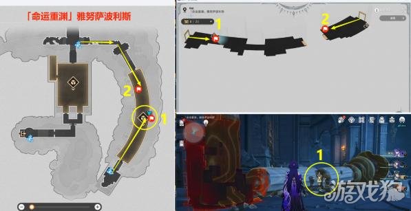 4、柱倒啦—:在1的位置回溯石柱,回快速站在石柱下面,让倒下的石柱砸中,即可获得该成就,如果传送点没开,可以从上面传送点去2处倒地石柱,完成成就。