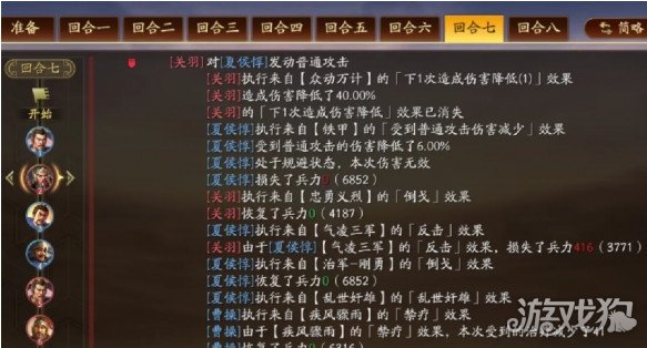 细节二:夏侯惇自带战法闪避后无法激活伤害,这是个缺陷,但是众动万计和气凌三军依然可以激活反击,如下图所示。