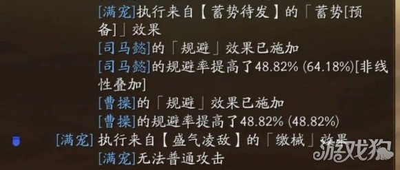 3)每回合概率获得概率的规避,吃智力加成。比如:受形一智力加成的满宠用蓄势规避概率可达将近50%。