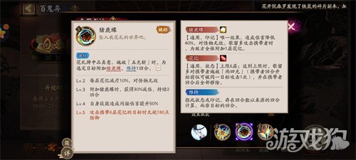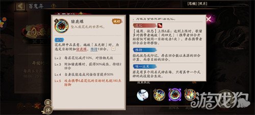 花札牌中品真意。施放『五光斩」时,为选定目标附加猪鹿蝶,维持1回合。