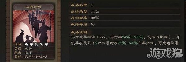 战法分析:这个战法一旦发动是极其强大的,首先治疗率和坐守孤城就差不多,然后40%概率的护盾虽然看脸,但是万一抵消了伤害那就非常好了。尤其是现在玩家普遍前几回合伤害非常高,如果你抵御了一次所向披靡,万箭齐发这样的伤害,那比加血量都要多。