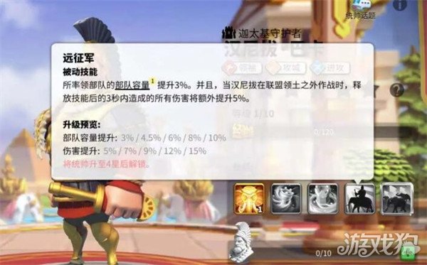 让部队的容量提升10%,当在外战斗时可以增加15%的技能伤害。