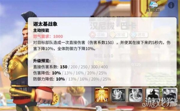 这个角色的主动技能为迦太基战象,可以对敌方单体造成伤害,同时5秒内减少25%的伤害和防御。