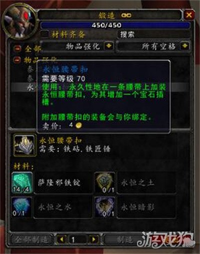 永恒腰带扣,萨隆邪铁锭*4,永恒之土,永恒之水和永恒暗影制作永恒腰带扣。