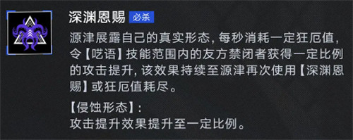 源津展露自己的真实形态,每秒消耗一定狂厄值令【呓语】技能范围内的友方禁闭者获得一定比例的攻击提升,该效果持续至源津再次使用【深渊恩赐】或狂厄值耗尽。