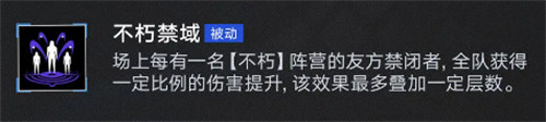 场上每有一名【不朽】阵营的友方禁闭者,全队获得一定比例的伤害提升,该效果最多叠加一定层数。