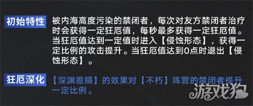 5、初始特性:被内海高度污染的禁闭者,每次对友方禁闭者治疗时会获得一定狂尼值,每秒最多获得一定狂尼值。当狂尼值达到一定值时进入【侵蚀形态】,获得一定比例的攻击提升。当狂值达到0点时退出【侵蚀形态】。