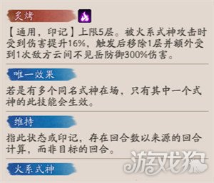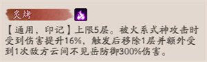 【通用,印记】上限5层。被火系式神攻击时受到伤害提升16%,触发后移除1层并额外受到1次敌方云间不见岳防御300%伤害。