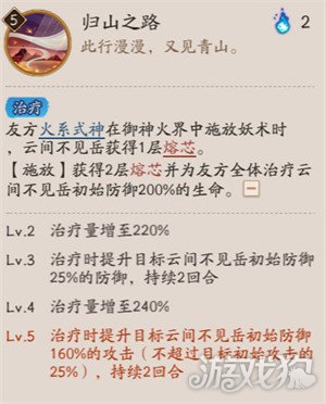 友方火系式神在御神火界中施放妖术时,云间不见岳获得1层熔芯。