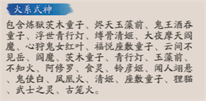 包含炼狱茨木童子、烬天玉藻前、鬼王酒吞童子、浮世青行灯、缚骨清姬、大夜摩天阎魔、心狩鬼女红叶、福悦座敷童子、云间不见岳、阎魔、茨木童子、青行灯、玉藻前、不知火、阿修罗、食灵、铃彦姬、闻人翊悬