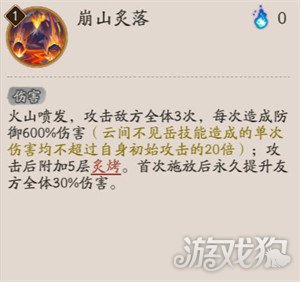 火山喷发,攻击敌方全体3次,每次造成防御600%伤害(云间不见岳技能造成的单次伤害均不超过自身初始攻击的20倍);攻击后附加5层炙烤。首次施放后永久提升友方全体30%伤害。