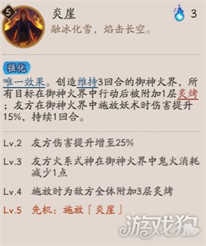 唯一效果。创造维持3回合的御神火界,所有目标在御神火界中行动后被附加1层炙烤;友方在御神火界中施放妖术时伤害提升15%,持续1回合。