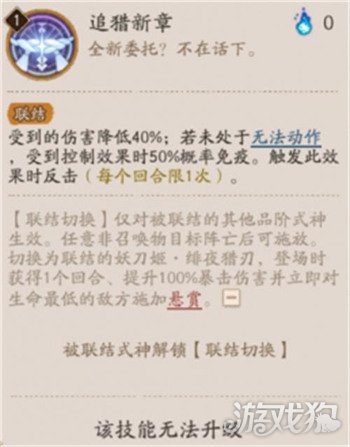 【联结切换】仅对被联结的其他品阶式神生效。任意非召唤物目标阵亡后可施放。切换为联结的妖刀姬·绯夜猎刃,登场时获得1个回合、提升100%暴击伤害并立即对生命最低的敌方施加悬赏。