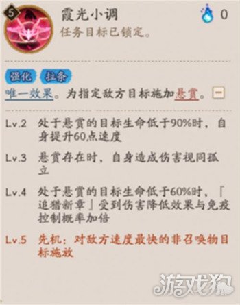 Lv.4 处于悬赏的目标生命低于60%时,「追猎新章」受到伤害降低效果与免疫控制概率加倍