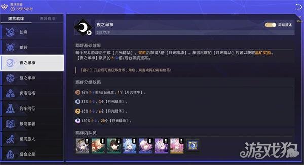 夜之半神类似于挖矿,玩家们在对局中获胜,可根据夜之半神羁绊当前的效果积累月光精华,每当月光精华足够时,玩家便能获取奖励,可为玩家积累大量的货币、装备和角色。此外,由于能组出夜之半神的角色有不少都有燃血羁绊,因此两者能互相搭配,例如7夜之半神4燃血等。