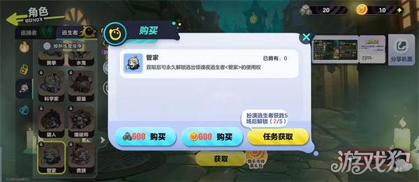 而这一个角色在获取时有三种不同的方法,首先可以通过局内的战斗还有日常任务去获取惊魂矿。这种货币就能够去购买,管家所需要的数量是600个,如果玩家觉得这个方法有一些复杂,也可以选择通过酷乐币购买,同样只需要600个,相对比较简单。通过任务也可以获取,例如扮演逃生者获胜5场之后马上就可以解锁,通过实战积累也可以免费的将它纳入到阵容中,对那些喜欢逃生玩法的玩家而言。这一个解锁方法还是很有趣味性的。