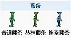 藤条 可以挂在草蔓延过的泥土块和丛林草地蔓延过的淤泥上。无论什么情况,下面必须有足够的空间供藤条生长(比如说火把和木制平台都会阻止它们生长)藤条可以被绝大多数武器和工具轻易切断,一旦藤条顶端或者藤条附着的砖块被破坏,整根藤条都会被摧毁。除此之外,如果藤条附着的砖块被钩爪勾住,藤条也会被摧毁。 藤条可以阻挡光线,但不会阻止行动。