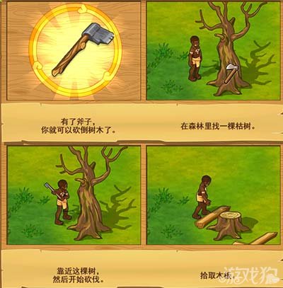 使用步骤:抡起斧头,找到一棵树,点击这颗树,开始砍伐,砍倒树木之后会获得木板,点击木板拾取。