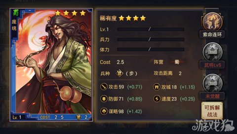 庞统这一个武将是四星武将,属于蜀国,所以这一个武将和蜀国的武将搭配在一起将会有属性上的加成。另外这一个武将拥有的兵种是步兵,并且自身的COST是二点五,在游戏的前期,这一个武将玩家就可以携带,可以让玩家在游戏的前期更好的发展。