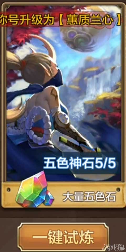 全民斗战神五色神石一键试练奖励。五色神石是建设洞府的重要材料,洞府的升级可以提升主角的生命,攻击和防御,而且还能提升聚宝的奖励数量。五色神石的获得重要途径试炼之地中的五色神石试练,开启后玩家可以试练五次。 玩家可以通过一键试练迅速完成任务,5次需要50钻。 难度二可以获得4000左右的五色石奖励,V3特权以上可以+10%的奖励。