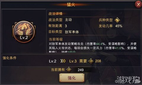 率土之滨每个英雄的技能都是最初的一级,而玩家想要更高的战斗力就要升级这些技能,升级技能需要战法51,而战法强化后的技能攻击效果更好,当你升级以后升到下一级的话就需要高达208战法,所以在这建议大家尽量把自己的主力武将都升级到2级以后再对其它的进行升级,这样会使自己的整体实力都有所增加。