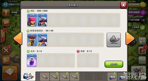 配兵:由于笔者虽然是九本,可是是一个速本的匹配宝宝。只有200单位营地和2级龙(七本的科技呦),所以就拿自己的配置来进行一下说明。20弓箭+9龙 联盟要龙球 药水带全狂暴,因为爆黑双王全程睡觉。这种配置如果遇到很良心的外置本可以下几个mm偷掉而不用下造兵费时的龙。我们都知道四个训练营是有顺序之分的,我会让一号训练营造mm,其余三个训练营造龙。这样的话 就算你下完了全部的mm也不会出现十条龙而把mm的位置挤掉。这种配置是不用开加速的,经济实惠又木有!