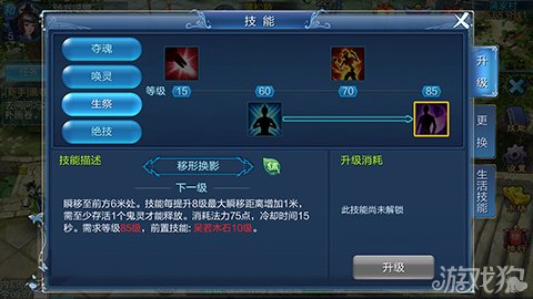 技能效果:瞬移至前方6米处。技能每提升8级最大瞬移距离增加1米,需至少存活1个鬼灵才能释放。冷却时间15秒。