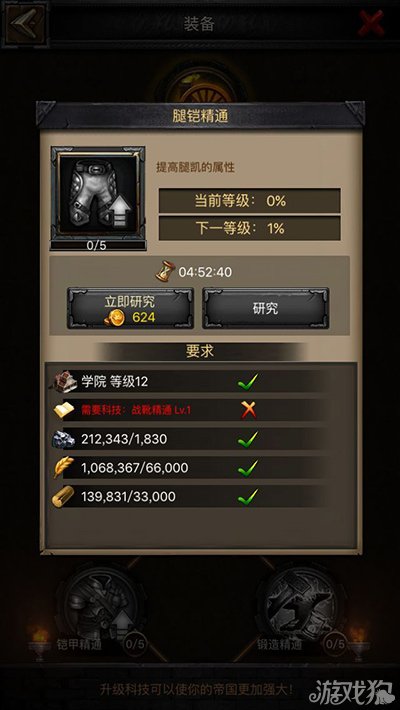 腿铠精通科技需要学院升级到12级,并且研究了1级的战靴精通作为前置技能。腿铠精通这个科技顾名思义就是提高腿铠装备的装备属性的科技。腿铠这间装备的核心属性是增加建筑物建造速度,不管是哪一件腿铠装备肯定都付有这条属性。总的来说这是一条非常实用的属性,对于玩家的发展十分有利。