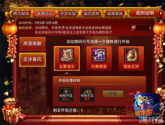 假设下我们充值三笔648,赠送的1944岁华结,将充值所得元宝十连抽得1555岁华结。共计有3499岁华结。然后我们兑换金鞋子花费1800岁华结,将金鞋子升级到4星后升级到橙鞋子消耗900岁华结!接着兑换橙头盔配方,又消耗900岁华结!!!!