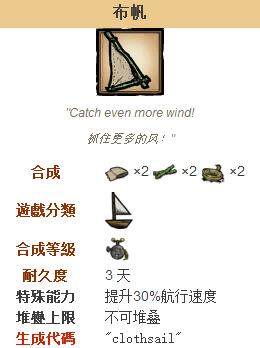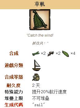 饥荒船难草帆和布帆介绍,航行速度不一样。帆是船难DLC中可合成的航海类物品,用于增加航行速度,并让玩家能够在航行过程中使用工具、武器和手持类光源。帆的耐久度会伴随着使用而下降;除了需要使用齿轮修复的螺旋桨外,修船工具可以一次性将帆的耐久恢复成100%。拖网与帆共用一个物品栏,但运作方式不同。木筏、竹筏、‘海脚’号和冲浪板等没有物品栏的船则无法装备任何帆。