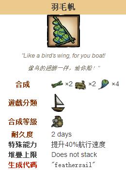 羽毛帆可以给船提供大量的速度加成。它的制作材料是2竹子、2绳索和4渡渡鸟羽毛,需要科学仪器解锁(与布帆和蛇皮帆不同)。与其他帆相比,它有着第二多的速度加成,但耐久度却和草帆一样只有2天。建议玩家在杀死任何渡渡鸟前先将它们繁殖至一定数量,这样一来就可以获得更多的羽毛资源。不然的话玩家将最多只能制作一张帆,并需要定期使用针线包修补。