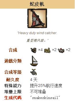 饥荒船难蛇皮帆和羽毛帆信息分享。蛇皮帆可以给船提供中等的速度加成。它的制作材料是4原木、2绳索和2蛇皮,需要炼金引擎解锁。蛇皮帆的耐久度是五种帆中最高的,与螺旋桨并列第一。不过,它的速度加成只位于草帆和布帆之间。蛇皮帆最适用于较难获得物资补给的远航。
