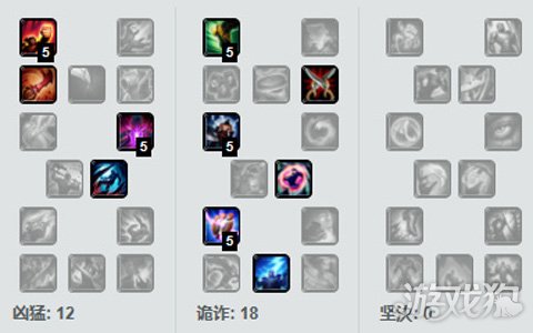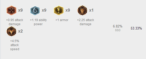 因为小丑的技能加成并没有属性转变,所以依旧是选择红色攻击力,蓝色固定法强,黄色固定护甲,精华1个攻击力和2个攻速。
