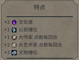 博物馆建造好以后就可以获得如下的一些提成了,最最重要的就是我们可以获得3个文物槽了,可以在这个城市里面放置文物了。