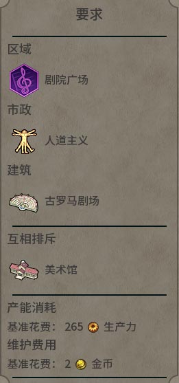 如下图,建造文明6博物馆的话,我们需要先建造剧院广场中心,在剧院广场建造好以后,我们就可以在博物馆和美术馆之间选择一个建造了,需要注意的是博物馆和美术馆一个城市只能建造一个哦,所以注意了。