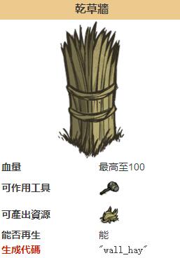 草墙可以被攻击并破坏,留下破损的草墙。使用锤子摧毁二级的草墙可以得到两个干草,摧毁其他级别的草墙可以得到一个干草。木墙最高生命值是100,初始状态是50。