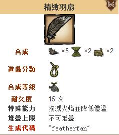 饥荒精致羽毛扇有什么用?怎么制作?精致羽扇Luxury Fan是DLC巨人王朝中新增的手持道具,可在生存类中合成。它需要五个羽绒,两个芦苇以及两个绳索,并且透过炼金引擎合成。它可用来扑灭附近火焰并减少体温50°C,但最低不会少于2.5°C。