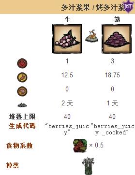多汁浆果恢复的饥饿度比普通浆果多33%,并会增加1点生命值; 烤多汁浆果恢复的饥饿度比普 通浆果多50%,并会增加2点生命值,然而它们的腐烂速度会提升3倍。