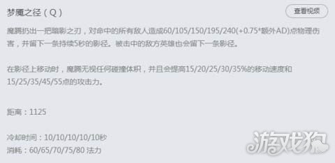 Q技能解析:梦魇的Q技能可以对一条直线上的单位造成伤害,并且留下一条影径,梦魇在影径上能够无视单位碰撞体积,还有移速和攻击力的加成。后期冷却属性足够高的情况下,接近于无限使用Q技能。因为Q技能有大量的AD加成,所以在施放平A被动和放R的时候有Q技能的存在才能收益最大化。