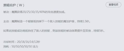 W技能解析:W技能有两个效果,第一个是被动获得攻速加成,让梦魇前中期拥有更快速的刷野能力,这样更早的到6级就可以到处抓人了。另一个就是主动施放,技能持续期间生成一个护盾,能够阻挡一次敌人的下一次技能,如果成功阻挡那么就能获得双倍的攻速效果。相比于轮子妈的E技能,显然梦魇的被动更强大。