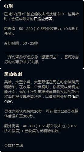 黑暗收割则是属于一个偏向成长类的符文,需要花费一定的时间才能获得更高的收益,除此之外黑暗收割在后期的团战中,可以起到刷新的作用,并多次触发,有利也有弊,就是成型慢,所以这两个天赋的取舍完全看个人喜爱,个人就喜欢简单又粗暴的电刑。